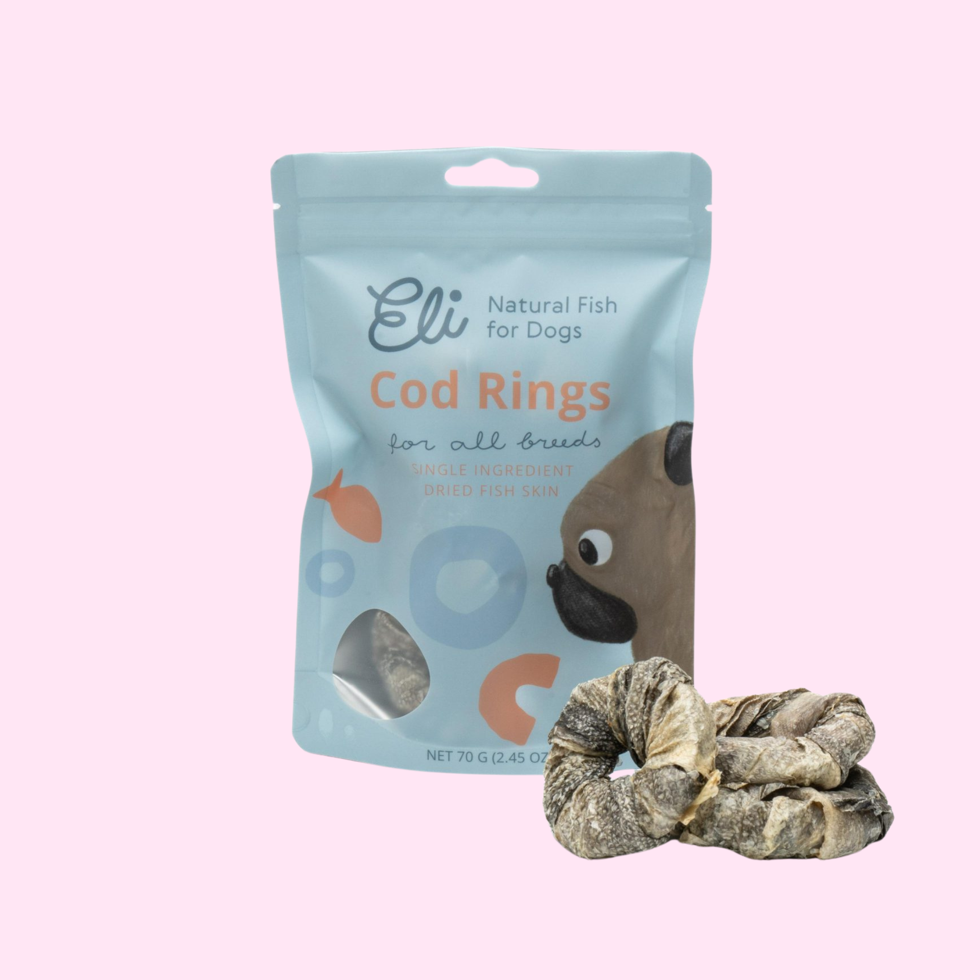 Les anneaux sont fabriquées exclusivement à partir de peaux de morue de haute qualité, soigneusement séchées afin de préserver leurs nutriments essentiels.